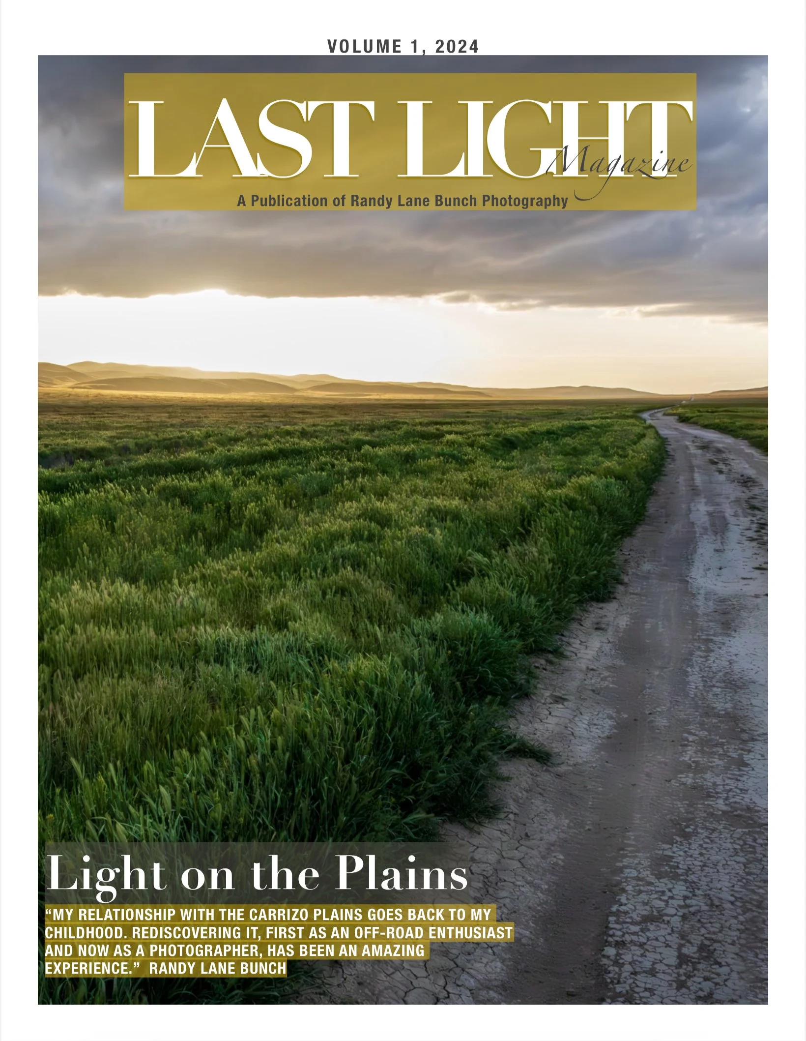 Last Light Magazine is a publication of Randy Lane Bunch Photography, highlighting various photo projects. This inaugural edition features the Carrizo Plains National Monument, a favorite photography destination for the author. (28 pages)